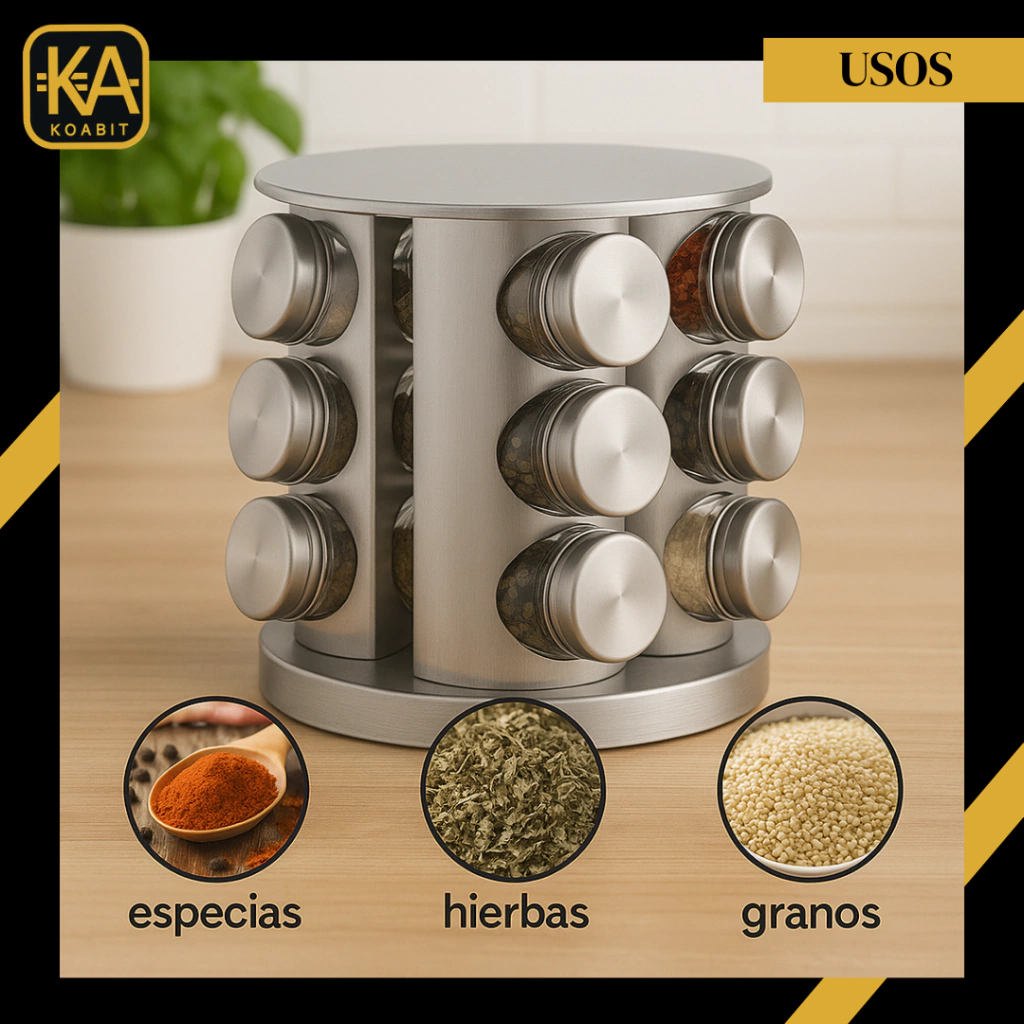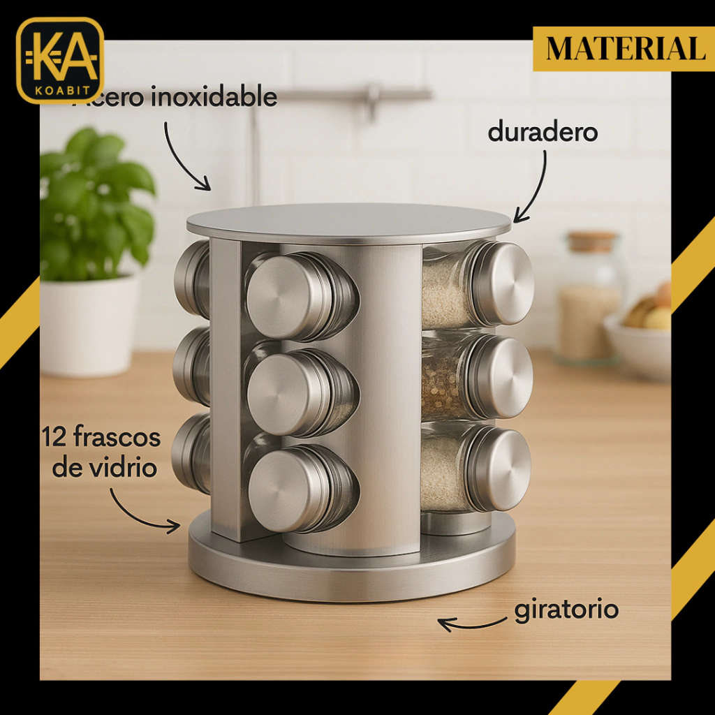El especiero giratorio de acero inoxidable KOABIT es la solución perfecta para mantener organizadas tus especias en la cocina. Con un diseño elegante y funcional, este especiero tiene una altura de 20.5 cm y un diámetro de 18.5 cm, ideal para cualquier mesa o encimera. Sus 12 frascos de vidrio, cada uno con una capacidad de 110 mL, te permiten almacenar una variedad de especias y condimentos, garantizando frescura y sabor en cada uso.