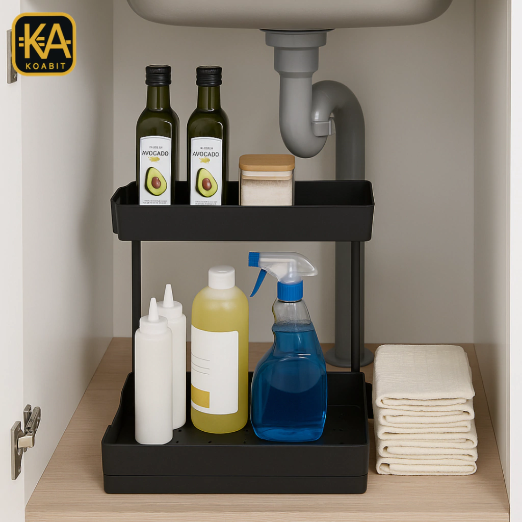 Optimiza tu espacio bajo el fregadero con el Organizador Bajo Fregadero de KOABIT. Este práctico accesorio cuenta con dos niveles que te permiten almacenar productos de limpieza, utensilios y otros esenciales de manera ordenada y accesible. Su diseño moderno se adapta a cualquier estilo de cocina, proporcionando no solo funcionalidad, sino también un toque estético.