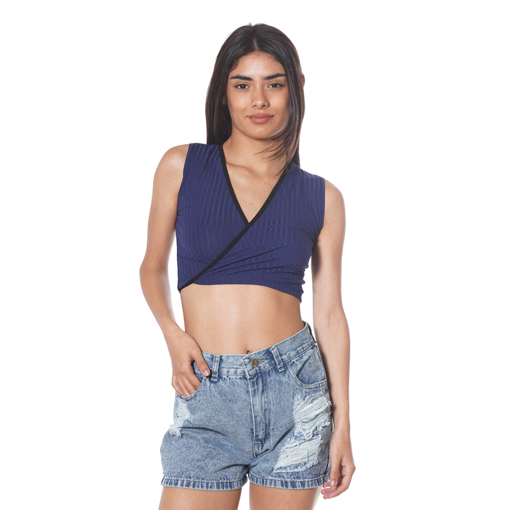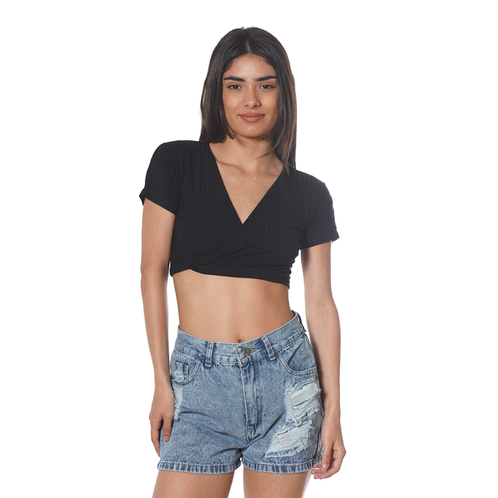 Este top presenta un corte cruzado en el frente que agrega un toque moderno y favorecedor.