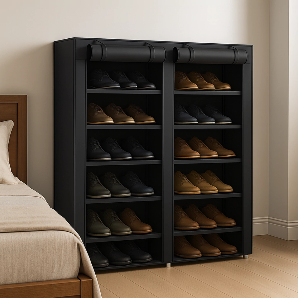 El Zapatero Doble Organizador Portátil Plegable de KOABIT es la solución perfecta para quienes buscan optimizar el espacio en su hogar. Con una altura de 107,5 cm, un ancho de 116 cm y una profundidad de 29 cm, este mueble moderno se adapta fácilmente a cualquier rincón de tu casa.